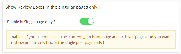 Enable this option if your theme uses the_content() in homepage and archives pages and you want to show post review box in the single post page only !