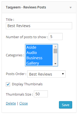 Use " Taqyeem - Reviews Posts " widget to display best reviews , most recent reviews or random reviews